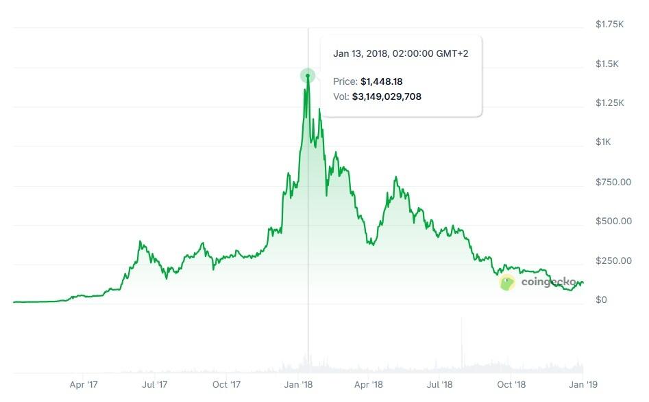 Most ICO-funded projects failed to deliver, and prices collapsed. By December 2018, ETH had fallen to around $85.