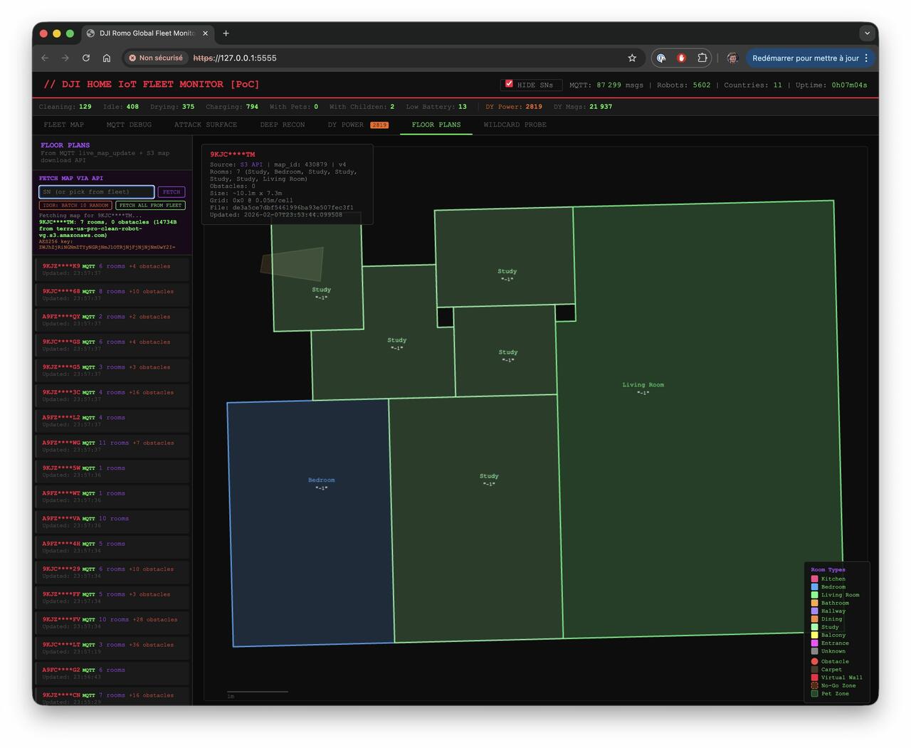 With nothing more than that 14-digit number, Azdoufal could not only pull up our robot, he could correctly see it was cleaning the living room and had 80 percent battery life remaining. Within minutes, I watched the robot generate and transmit an accurate floor plan of my colleague’s house, with the correct shape and size of each room, just by typing some digits into a laptop located in a different country.